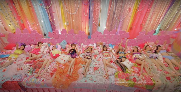 Heavy Rotation, on the other hand, exemplifies the civilised, harmless disciplining approach that produces “docile bodies.” Assigned with certain positions and instructed to perform specific acts, the idols follow disciplinary guidance that brings “happiness and order.” The large size of the forty-eight-member group – reminiscent of the size of a prison sector or a class at school – helps to establish a normative system which easily transcends the abnormal. The homogeneity leads to an elimination of individuality: although there are leading idols that receive more attention than others, they are nevertheless absorbed by the underlying atmosphere of pink and sweet. Foucault introduces the idea of “docile body”: bodies of prisoners, soldiers, workers, and students, subjected to disciplinary power and rendered easy to control. The docile body, contrary to the tortured ones, is not broken nor brutalised (as Major’s body); it is precisely its intact and healthy appearance that demonstrates the power of discipline – resembled by the clean, beautiful, and almost perfect bodies in AKB48’s video. The elements of cuteness – teddy bears, bunnies, lacy cushions, heart-shaped pillows, cat-like customs, and cupcakes – are various symbols of docility. Even the moments suggestive of homosexual love – no matter how transgressive as it first sounds – also fit into the narrative of docility. Girls are displayed as frolicking with each other and sharing desserts (with sexual innuendo, of course), which generate an overwhelming sense of cuteness and innocence. The video presents a version of ideal femininity, in which docility and harmlessness are crucial features.