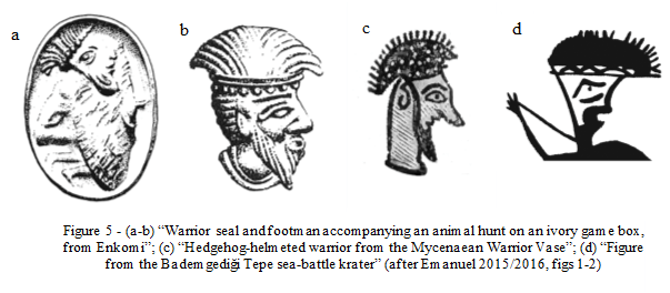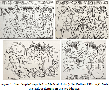 Most recent scholarship is concerned with the identities and origins of the people who rested in these coffins, especially in those characterised as ‘grotesque’. This is because their distinctive ‘feathered’ headdress, which renders them unique from all other anthropoid coffins found both in Egypt and the Canaan region, strongly alludes to the Sea Peoples depicted on the walls of Medinet Habu (figs. 1, 4) as well as several other media from all over the Late Bronze Age world (fig. 5). Interpretations of the different designs found on the headdresses, such as the number of bands, the knobs, and the zigzag pattern, fluctuate between being markers of different groups of people and s within a specific “tribe or clan”.