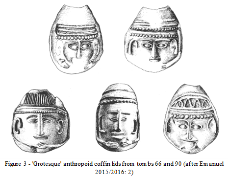 Some fifty clay anthropoid coffins were unearthed from the Northern Cemetery of Beth, a town situated in northern Israel (fig. 1). The burial custom of anthropoid coffins had been developing since Egypt’s Middle Kingdom; however, it slowly spread into Canaan during the New Kingdom. Most of these coffins depict ‘naturalistic’ human faces on their lids (fig. 2), sometimes accompanied with hair. It is generally agreed that the ‘naturalistic’ coffins date from the beginning of the thirteenth to the end of the eleventh centuries BC while the ‘grotesque’ appeared only in the twelfth century BC, during a time when the town was an Egyptian garrison under Ramses III.
