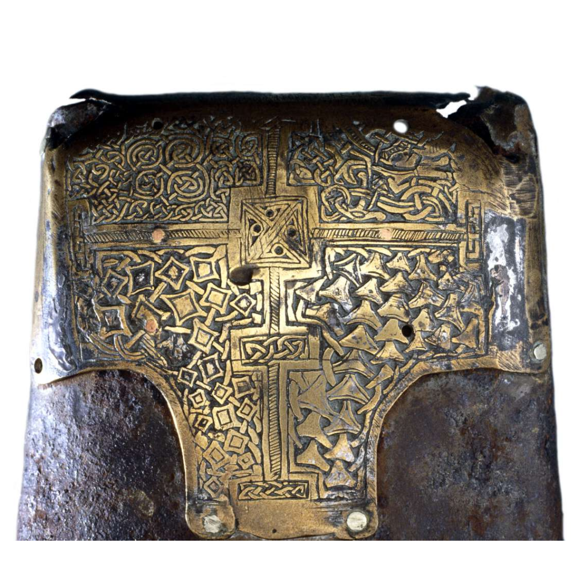 While the development of handbells shows the relationship between metalworking and Christianity, the design of St Conall Cael’s bell also illustrates the cosmopolitan influences on art in Ireland during that period. Both the original bell and its mount have suffered damage, but an engraved cross and interlacing patterns can still be seen. Early medieval art in the Atlantic Archipelago has often been characterised as ‘insular’, but this artefact shows the blending of different artistic traditions thanks to cross-cultural connections. The bronze mount on St Conall Cael’s bell indicates the borrowing of themes from Scandinavian art by Irish craftspeople. The outer fields of the cross on the mount are decorated with a highly unusual combination of Scandinavian Borre ring-chain patterns and Jellinge-style animal interlace. The adoption of these art styles into ecclesiastical metalwork shows that the two cultures had productive exchanges after Scandinavian settlers established themselves in tenth-century Ireland. Although Scandinavians, or Vikings, are often characterised as violent raiders who destroyed Irish monastic communities, the synthesis of art styles visible in St Conall Cael’s bell shows that the situation was more nuanced.