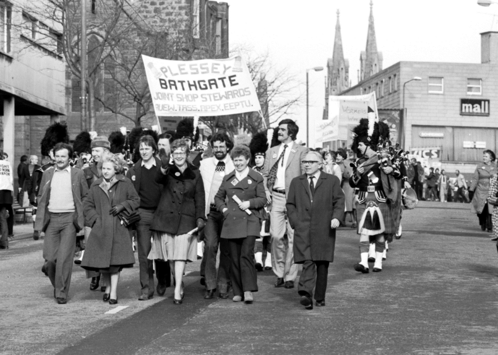 Figure 4: ‘Demonstration in Support of the Plessey Occupation, March 1982’. The Scotsman Publications Ltd. Access via The Open University: https://www.open.edu/openlearn/society-politics-law/the-plessey-factory-occupation-bathgate-1982