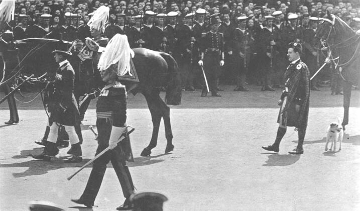 In tracking archaeological evidence of dogs, their presence follows early agricultural settlements. They are present in cave paintings, in Roman mosaics, in narratives like the Odyssey, to early modern paintings and photographs from as soon as the camera was invented. For much of this time period, they were for hunting, or other roles in permanent settlements, such as herding, guarding, tracking, controlling pests, and pulling sleds. There are accounts that describe them being used in battles, such as in sixth-century Ireland or in Viking raids, but what they did is unclear. Furthermore, toy breeds bred for luxury and status like the Maltese and Pekingese have existed for at least two thousand years. In collaboration with more species than just humans, dogs would be used in falcon hunting, where the dog would flush smaller birds for falcons like the peregrine to catch on behalf of itself, the dog, and the human. In medieval Christendom, there was initial disdain for dogs, but their association with hunting had raised their status by the early modern period to something of the acclaim they enjoy today. And by the nineteenth century, they were often honoured, beloved pets. Queen Elizabeth II was known for her corgis, but each monarch since Queen Victoria has had their personal dogs they adored. Queen Victoria received dogs as diplomatic gifts from within the British Empire and without it, while Prince Albert was the one who popularised the dachshund in Britain. In 1854, the royal family spent £25 19s on photographing their dogs, the equivalent of £1650 today. Edward VII’s beloved terrier Caesar walked behind his casket at his state funeral.