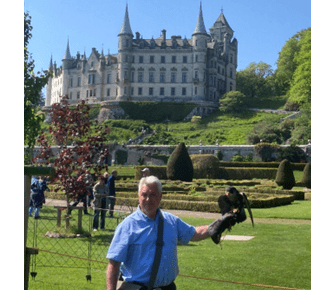 Figure 2: Falconer and peregrine falcon in front of Dunrobin Castle, May 2024.