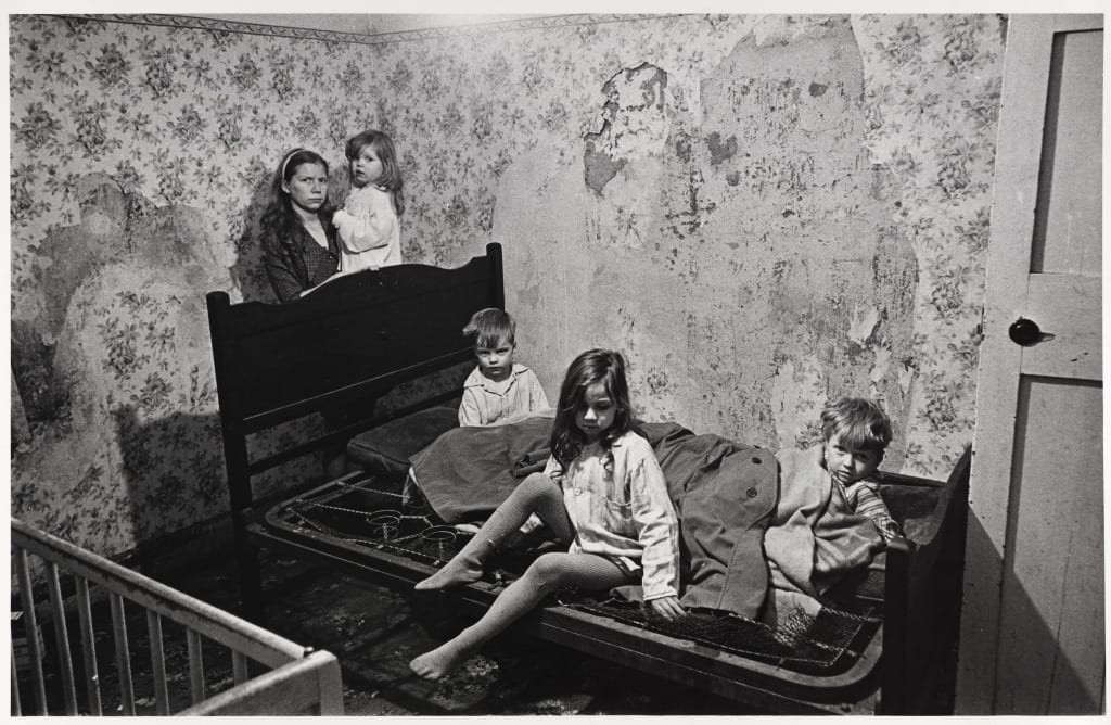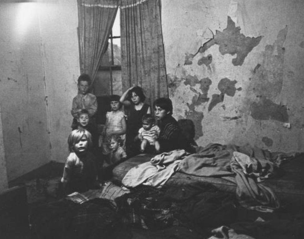 This image shows a mother and her four young children living in a house with peeling wallpaper, dirty (and potentially mouldy) floors and furniture, and “old ‘macs’” as a mattress. This photograph highlights the poverty and substandard living conditions which remained in Britain, emphasizing how not everyone felt the benefits of increased consumerism and household spending, as this family does not have adequate furniture or safe living conditions.