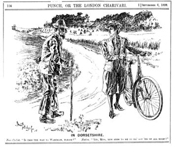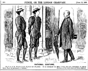 So how did the bicycle become associated with the feminine quest for freedom? Between 1885 and 1900, no fewer than two hundred cartoons were published depicting the New Woman in innovative, athletic clothing. Punch magazine published the brunt of these, perpetuating the infamous image of the ‘New Woman’, thus enabling and validating women into these new athletic pursuits, though this was not, of course, their intention. The representation of the athletic woman was meant to be a parody – of course, who would aspire to such a thing? – but in the long term, this could not have better served the cause. Women now had an athletic image to look up to, with the new illustrations of their modified clothing putting them almost at equal with men; Punch’s cartoons consistently dressed women in traditionally male clothing. In 1896, Punch published an image of two women in the, by that point, popular bicycling costume for those who did not want their clothing to get caught in the spokes (Fig. 3) – the vicar within the cartoon mistakes them for men in their trousers and hats. Punch certainly exaggerated the changes in female fashion, though, as established, it was not without cause. By 1899, when Figure 4 was published, they no longer even characterised the female cyclist as the ‘New Woman’; the concept was so ingrained within the public perception, as a result of such heavy anti-cycling propaganda, it did not need pointing out. The bicycle had become almost synonymous with the emerging liberation movement.
