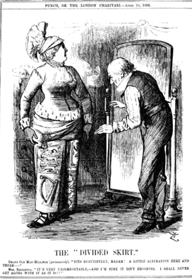 The more practical of objections to female cycling, by both the general public and medical practitioners, was the issue of clothing. The female safety bicycle differed to the man’s with the absence of the crossbar between the saddle and steering rod, but it had far less stability and much more weight while in use with the woman’s clothing bundled atop it. To use a man’s bicycle in long skirts was borderline impossible. The only option was to alter the clothing being worn, but this was easier said than done. Early solutions were impractical – skirts had to be wide enough to conceal the “ugly and inelegant” pedalling of the woman, but not so wide as to cause the cyclist to be thrown off balance in the wind “like a sailboat under full sail”, nor so wide as to incur the danger of the material getting caught in the spokes. It was thus no surprise that the issue was then sought to be solved more radically. The ‘Divided Skirt’ (as satiricised by Punch in Fig. 2) was the first compromise; bloomers, over which a woman wore a buttoned skirt that was then left unbuttoned while riding. The divided skirt was mocked and seen as an attempt by women to masculinise themselves, emphasising that to be a New Woman was hardly to be a woman at all.