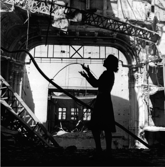 Miller’s 1945 photograph Irmgard Seefried Opera singer, singing an aria from ‘Madame Butterfly’ was taken in Austria as Miller documented the lives of Europeans in the immediate post-war period. It features the striking silhouette of the German opera singer, Irmgard Seefried, against the backdrop of Vienna’s war-wounded Opera House. Miller’s surrealist influences are immediately apparent upon looking at the monochrome image. The ‘frame within a frame’ draws the eye to the simple, softer human silhouette set against the harsh and complex lines of the destroyed theatre, the figure of Seefried taking striking precedence in the apocalyptic scene. Her upright, powerful posture speaks to feelings of hope, providing a characteristic surrealist juxtaposition. Advancing this idea is the balance in the composition of the piece. Areas of pure black in the silhouette and the bottom left of the foreground are evened out by thick architectural lines, which lead the eye towards the top of the frame. Repeated linear intersections across all planes of the image reinforce the sense of stability in the photograph. This is completely incongruous with its themes and iconography – there was little stability to be found anywhere in post-war Europe. Thus, Miller presents the devastation of war and the strange beauty of reconstruction in tandem, revealing the horror of the Second World War while equally giving voice to the strength and resilience of ordinary civilians throughout the conflict and in its immediate aftermath.